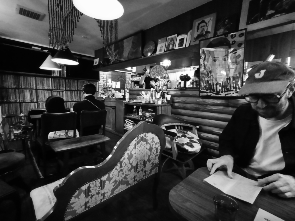 Cinco en punto, o quizás un par de minutos después de la hora, arribé a la estación de metro donde habíamos fijado nuestro encuentro. Apenas lo divisé, su cálido saludo de familiaridad en ese entorno me hizo sentir que estaba en el camino correcto, y vaya que así era. Comenzamos la caminata a nuestro destino, el cual aún desconocía, y en el transcurso de ella, Mark me compartió efusivamente la historia del café que visitaríamos. Así como varios Jazz Kissa que son una simbiosis indivisible entre propietario y espacio, el paso del tiempo ha ido cobrando su cuota y en ese transcurrir varios dueños han fallecido. En el caso del café al que nos dirigíamos, tras la muerte del propietario original, la colección de vinilos, mobiliario y hasta artículos de cocina terminaron resguardados en una bodega en una suerte de deseo latente de que un futuro lograra reinstalarse. Gracias a una antigua y asidua clienta que rescató esa voluntad, tras años logró instalar Masako Jazz Café en una nueva ubicación y creó así un portal donde conviven dulcemente pasado y presente.